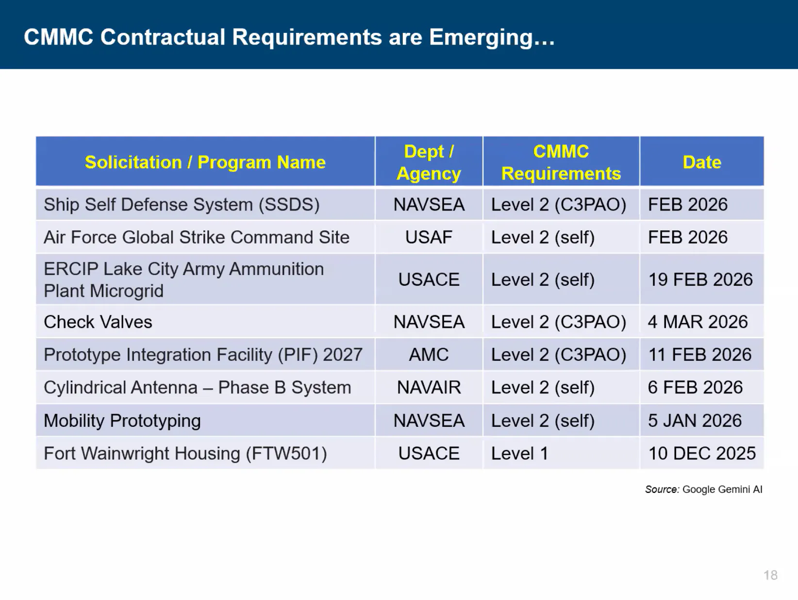 The examples shared spanned agencies including NAVSEA, USAF, USACE, and NAVAIR, with requirements ranging from Level 1 to Level 2 and, notably, a mix of both self-assessments and third-party (C3PAO) assessments depending on the program. These are not future-state projections. They are current opportunities with defined timelines, several of which fall within early 2026.