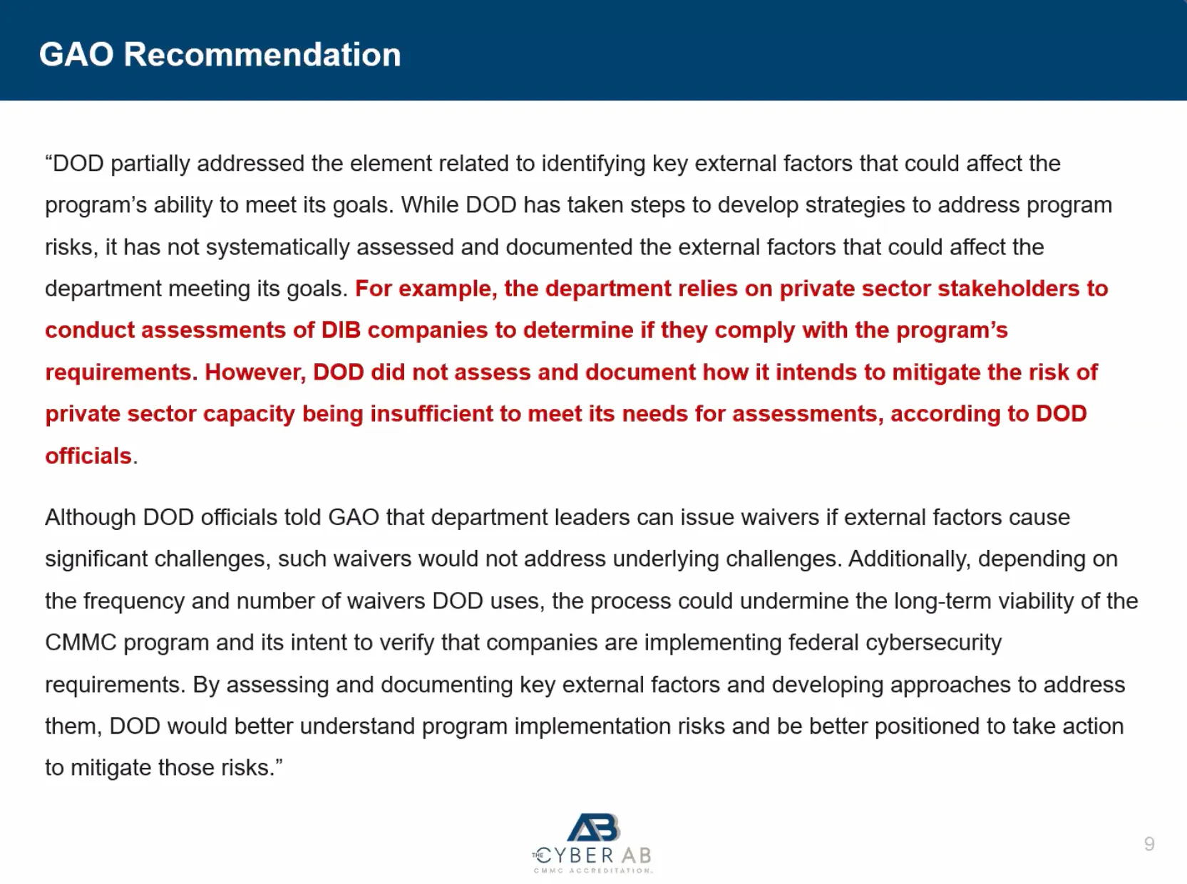 One of the key concerns is the reliance on private sector organizations to conduct assessments, and whether there is sufficient capacity to meet demand over time. While the DoD has mechanisms such as waivers to address short-term challenges, the report notes that these do not resolve underlying structural risks.