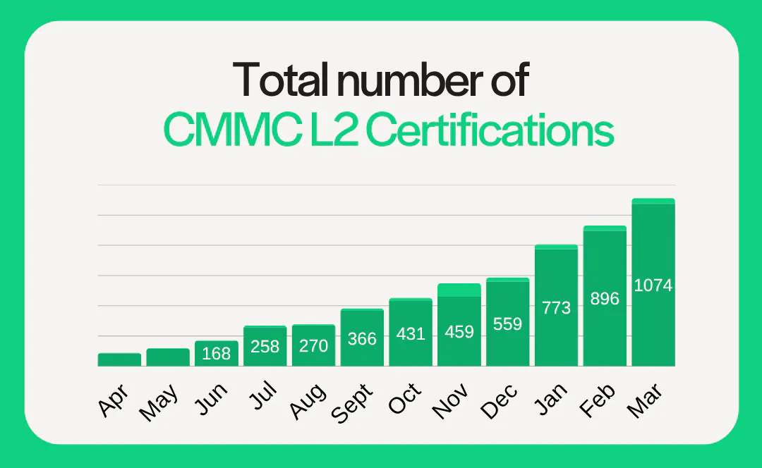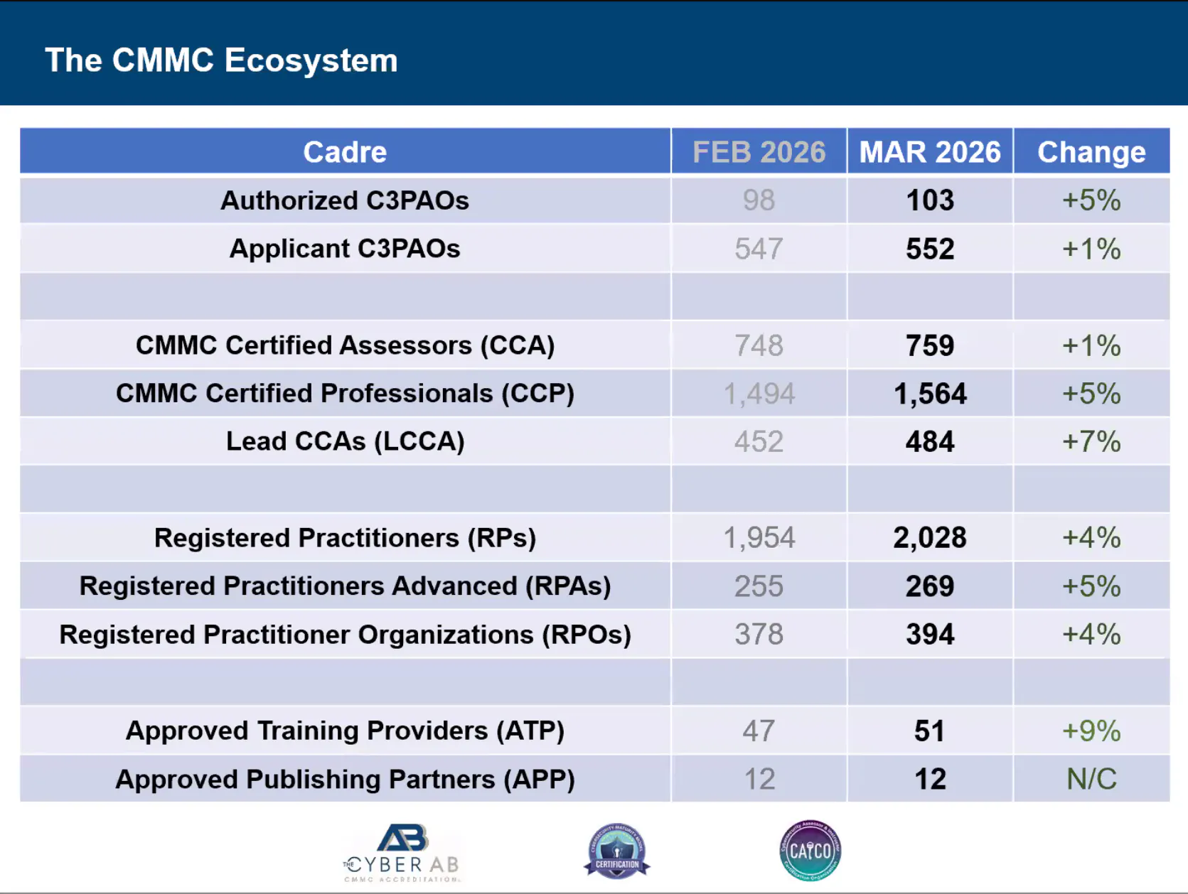 The March update also showed continued growth across the CMMC ecosystem, with increases in authorized C3PAOs, certified assessors, and practitioners.