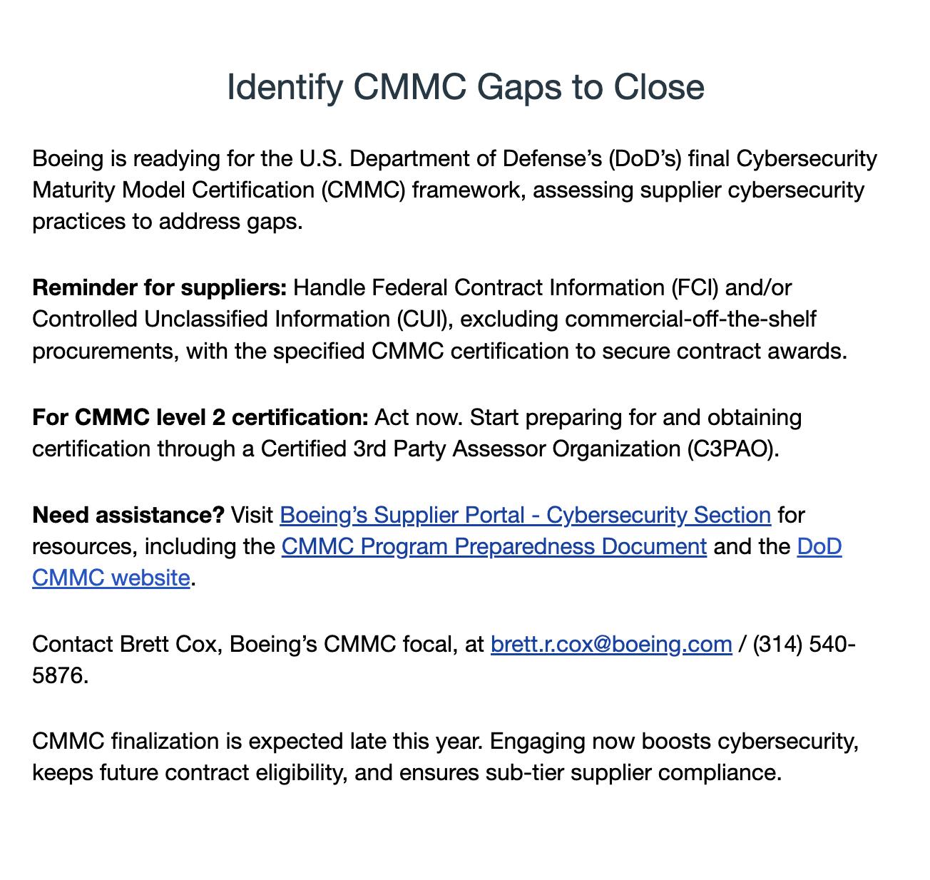These efforts aren’t recent. Boeing has been keeping CMMC top-of-mind for its suppliers in its monthly newsletter, starting all the way back in January 2025 and continuing to date.